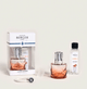 Lamp sold in a pretty box with its accessories: burner wick, straight and heavy shiny silver frame, extinguisher and funnel + 2 refills: Ocean Wind (180 ml/6.0 oz) and Essential Neutral (180 ml/6, 0oz)